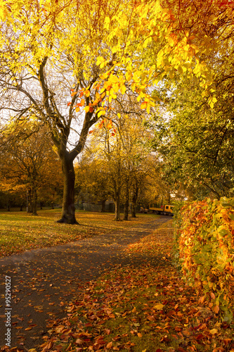 Fototapeta premium Beautiful and bright autumnal trees in Scottish park with afternoon sunlight.