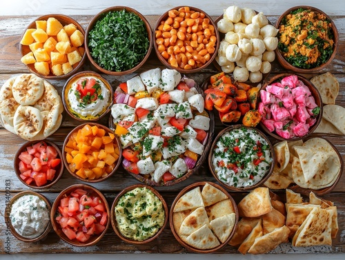 Fototapeta premium Beautiful and colorful middle eastern mezze spread arranged on a rustic table with various delicious dishes