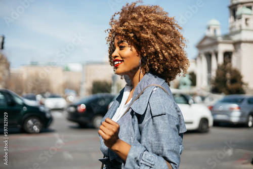 Fototapeta premium Beautiful and confident black woman walking down the street. She is happy and...