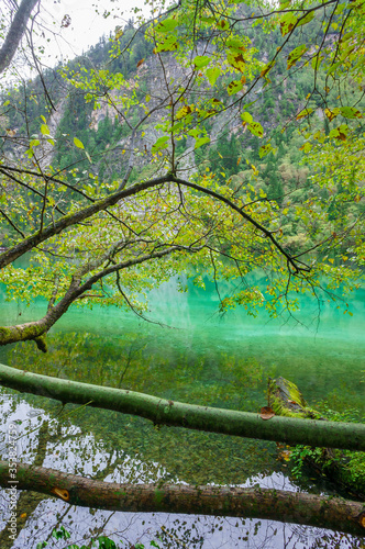 Fototapeta premium Beautiful and fresh scenery along the crystal clear lake with green algae, reflection and trees perfect for mind relaxing during holidays at Jiuzhaigou Valley National Park.