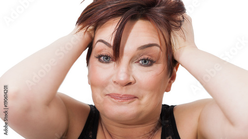 © patronestaff, Naklejka premium Beautiful and funny woman portrait pulling her hair with amused look