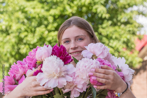 Fototapeta premium Beautiful and happy young girl in the summer with a beautiful bouquet of peonies in nature