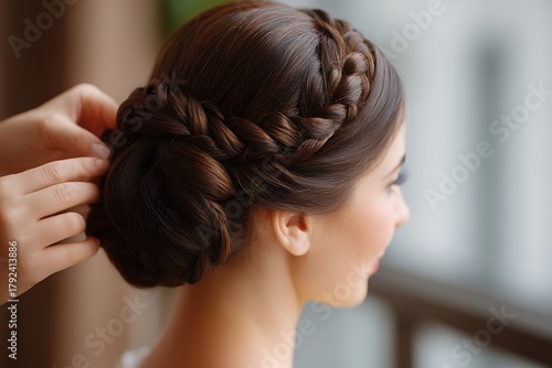 Naklejka premium Beautiful and intricate braided updo for a bride, showcasing sophisticated...