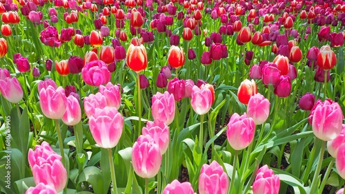 © TS.PHOTOS, Fototapeta premium Beautiful and lovely pink tulips and green leaves in the field