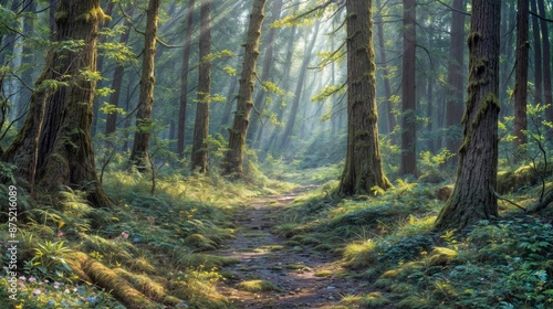 © Viktor, Obraz premium Beautiful and peaceful forest with pathway. AI generated.