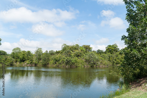 Fototapeta premium Beautiful and peaceful natural lake surrounded by trees on a sunny day.