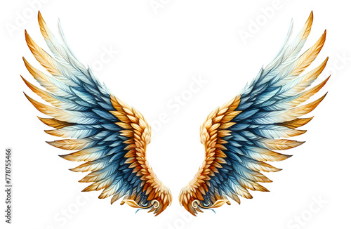 © Abuhena, Obraz premium Beautiful angel wings blue yellow front view isolated on transparent background