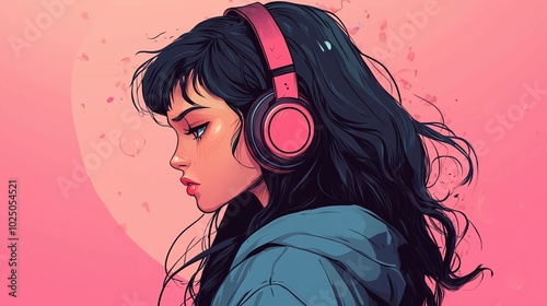 © Oleg, Obraz premium Beautiful anime girl listening to lofi hip hop music with headphones. Manga, cartoon drawing.