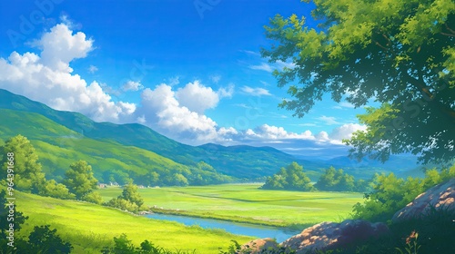 Naklejka premium Beautiful Anime Landscape with Lush Green Fields and Mountains