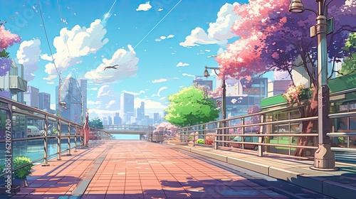 Fototapeta premium Beautiful anime-style illustration of a city street at springtime