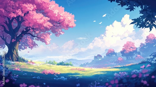Fototapeta premium Beautiful anime-style nature background, featuring colorful landscapes and peaceful vibes.