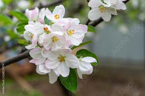 Fototapeta premium Beautiful Apple flower blossom blooms in garden plantation