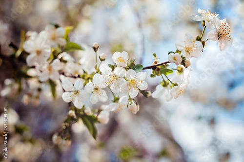© Юлия Лисяная, Obraz premium Beautiful apple tree branch with sun. Blooming apple tree in spring time.