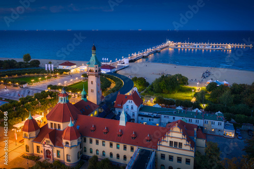 © Patryk Kosmider, Obraz premium Beautiful architecture of Sopot city at the pier (Molo) by the Baltic Sea at dusk, Poland.