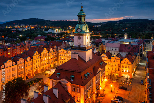 © Patryk Kosmider, Naklejka premium Beautiful architecture of the Town Hall Square in Jelenia Gora at dusk, Poland