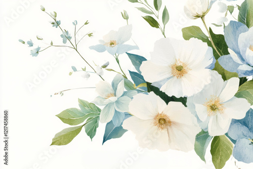Fototapeta premium Beautiful arrangement of white and light blue flowers with green leaves on a...