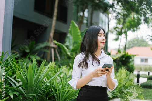 Naklejka premium Beautiful asian business woman using on smartphone while walking outdoor