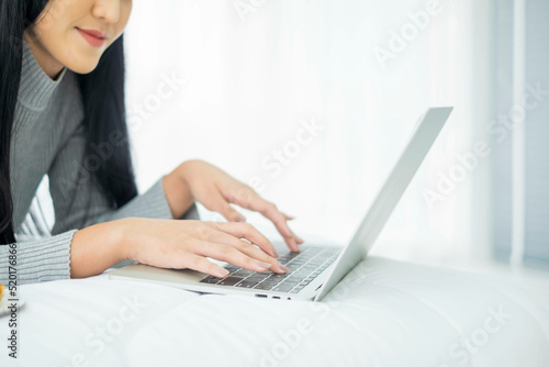 © Tamonwan, Fototapeta premium Beautiful asian eat show pizza and cola drink on bed. Happy woman sitting eating fast food. Lovely young working on laptop from home hand holding with junk food and soft drink showing. out of focus.