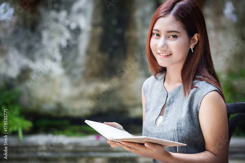 Obraz premium BEAUtiful asian girl happy and relax reading book in green garden with white...