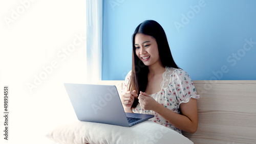 Naklejka premium Beautiful Asian girl, wearing a floral shirt, is ordering online on a laptop computer, happily, holding a credit card in her hand, picking up to pay with a credit card,online shopping.