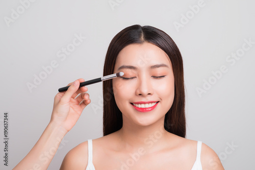 Fototapeta premium Beautiful asian woman face with perfect makeup applying blusher.