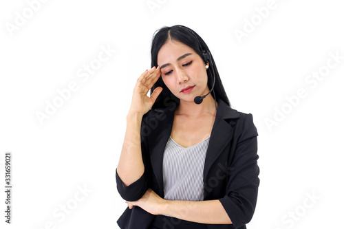 © keatikun, Fototapeta premium Beautiful asian woman Serious call center operator in wireless headset talking with customer,in customer support service.