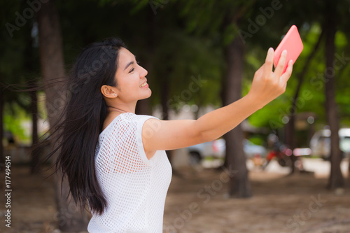 Naklejka premium Beautiful Asian woman vacation on beach of Thailand