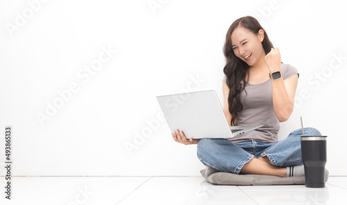 © chalongrat, Fototapeta premium Beautiful Asian woman wearing grey casual shirt using laptop on white background and copy space. Cute Asian woman sitting on the floor room relaxing and excited something for work from home concept