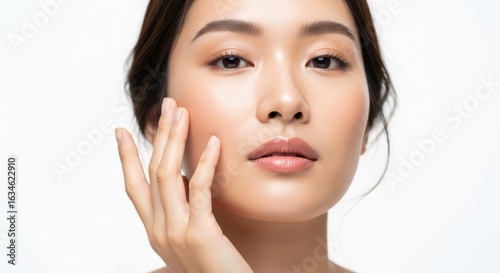 © Abir, Fototapeta premium Beautiful asian woman with radiant skin, applying facial cream for hydration and a healthy glow, closeup portrait