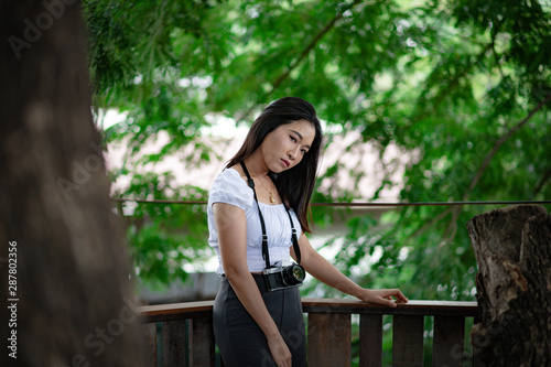 Naklejka premium Beautiful Asian woman with vintage film camera