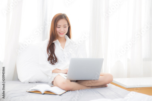 Fototapeta premium Beautiful asian young woman setting on bed using laptop computer and notebook...