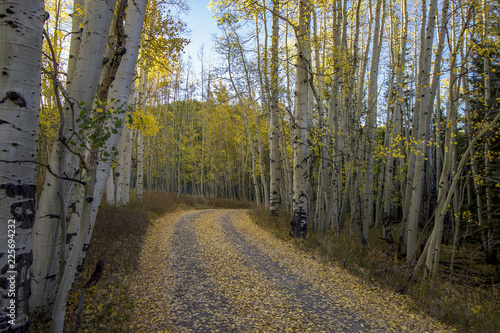Fototapeta premium Beautiful Aspen tree lined road to nowhere in the fall.