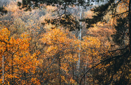 Fototapeta premium Beautiful aspens with fiery orange leaves in the wild forest forest. Selective focus.