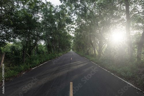 © yotrakbutda, Fototapeta premium Beautiful asphalt road in the forest with sunset.