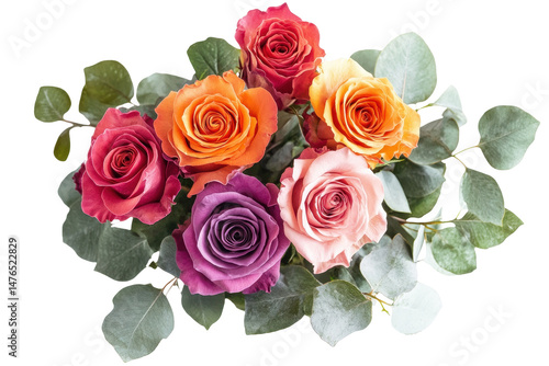 Obraz premium Beautiful assorted roses bouquet with greenery isolated on white ideal for...