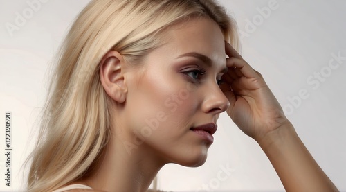 Naklejka premium Beautiful attractive blonde woman model woman thinking with hand in her head
