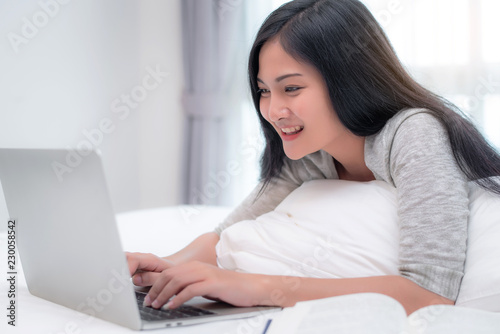 Naklejka premium Beautiful attractive young Asian woman using laptop at bedroom in the morning, laying on the bed.