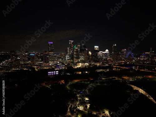 Obraz premium Beautiful Austin skyline at night with a stunning aerial drone view