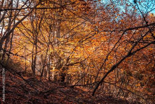 Fototapeta premium Beautiful autumn beech forest with yellow and orange colors. Beech Forest of...