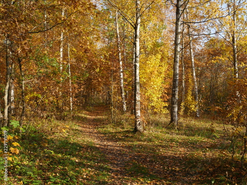 Obraz premium Beautiful autumn forest, path goes into the distance, falling yellow leaves