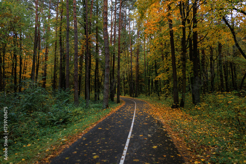 Fototapeta premium Beautiful autumn forest path surrounded by tall trees with golden leaves, creating a peaceful and scenic atmosphere in nature.