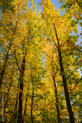 © Максим Хасанов, Fototapeta premium Beautiful autumn forest with yellow and red trees at sunset