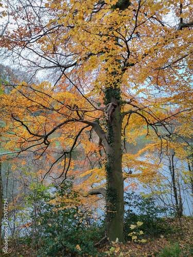 © Menyhert, Fototapeta premium Beautiful autumn image of the branches of a European beech tree (Fagus Sylvatica) with vibrant yellow to orange colored leaves.