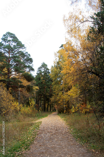 Obraz premium Beautiful autumn landscape on a clear September day in a mixed forest.