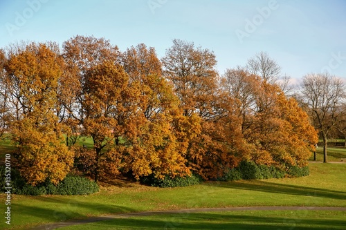 Fototapeta premium Beautiful autumn landscape with coloured trees, blue sky and green field.