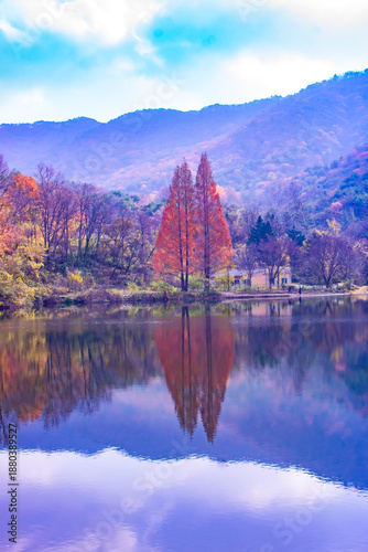 © juwan, Fototapeta premium Beautiful autumn landscape with red Metasequoia trees reflected in a calm lake