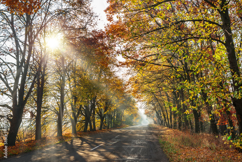 Naklejka premium Beautiful autumn landscape with the road and the sun's rays of the setting sun.