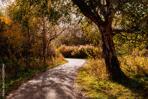 Fototapeta premium Beautiful autumn landscape with yellow leaves of trees and a path in the park