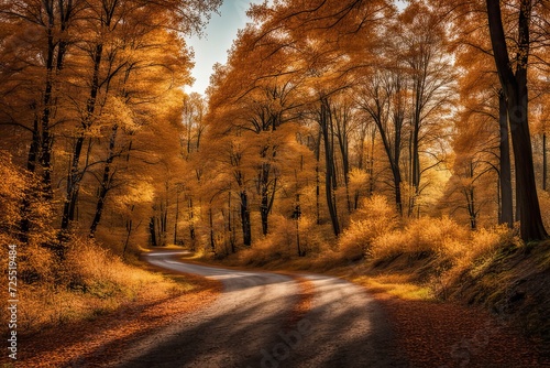 © law, Fototapeta premium Beautiful autumn landscape with yellow trees and sun.