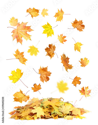 Fototapeta premium Beautiful autumn leaves falling on white background